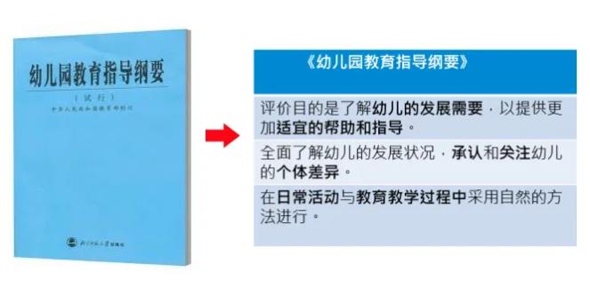 幼儿园教育指导纲要(试行)2001年7月2日 教育部印发将教育评价纳入其中。其中第四部分教育评价提到: